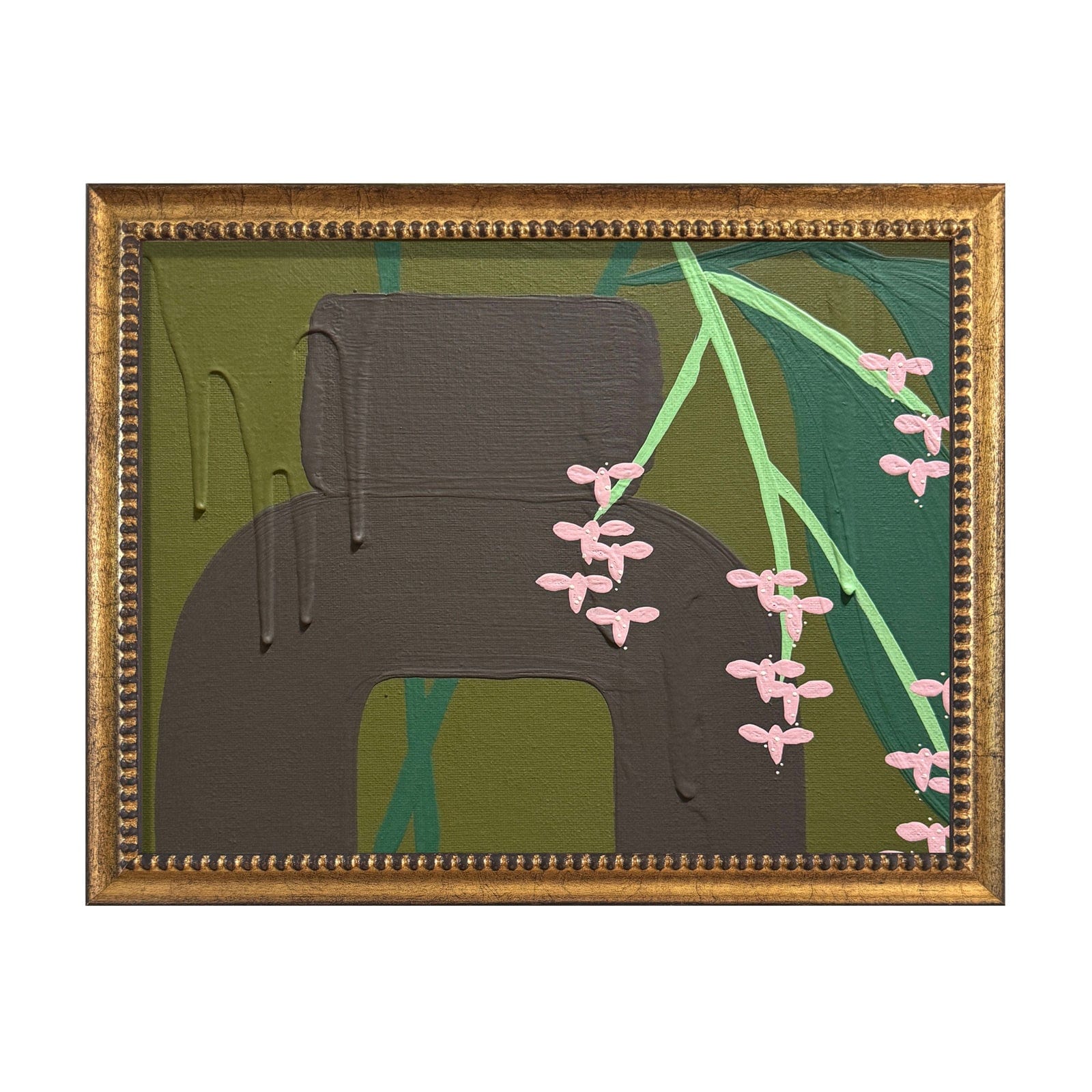 Ron's inspiration for this series comes from his love of how simple shapes can say more than words. Graphic and bold. Each one is hand-painted with heavy strokes of acrylic on canvas board. The colors mix perfectly with the classic wood antiqued gilt gold foil frame and look beautiful standing alone, in a grouping or mixed and matched on a gallery wall. Each frame is finished by hand to look vintage with an aged patina.