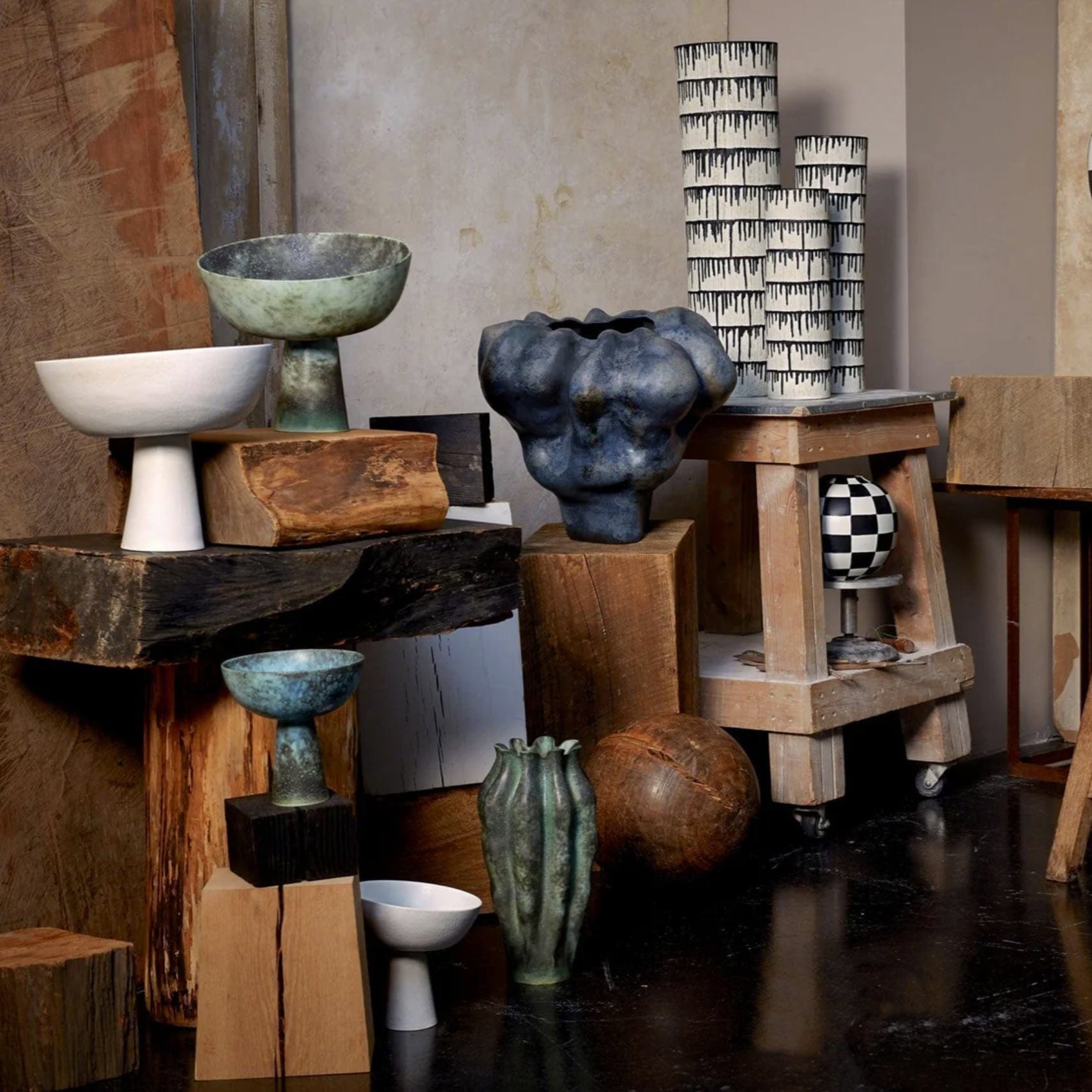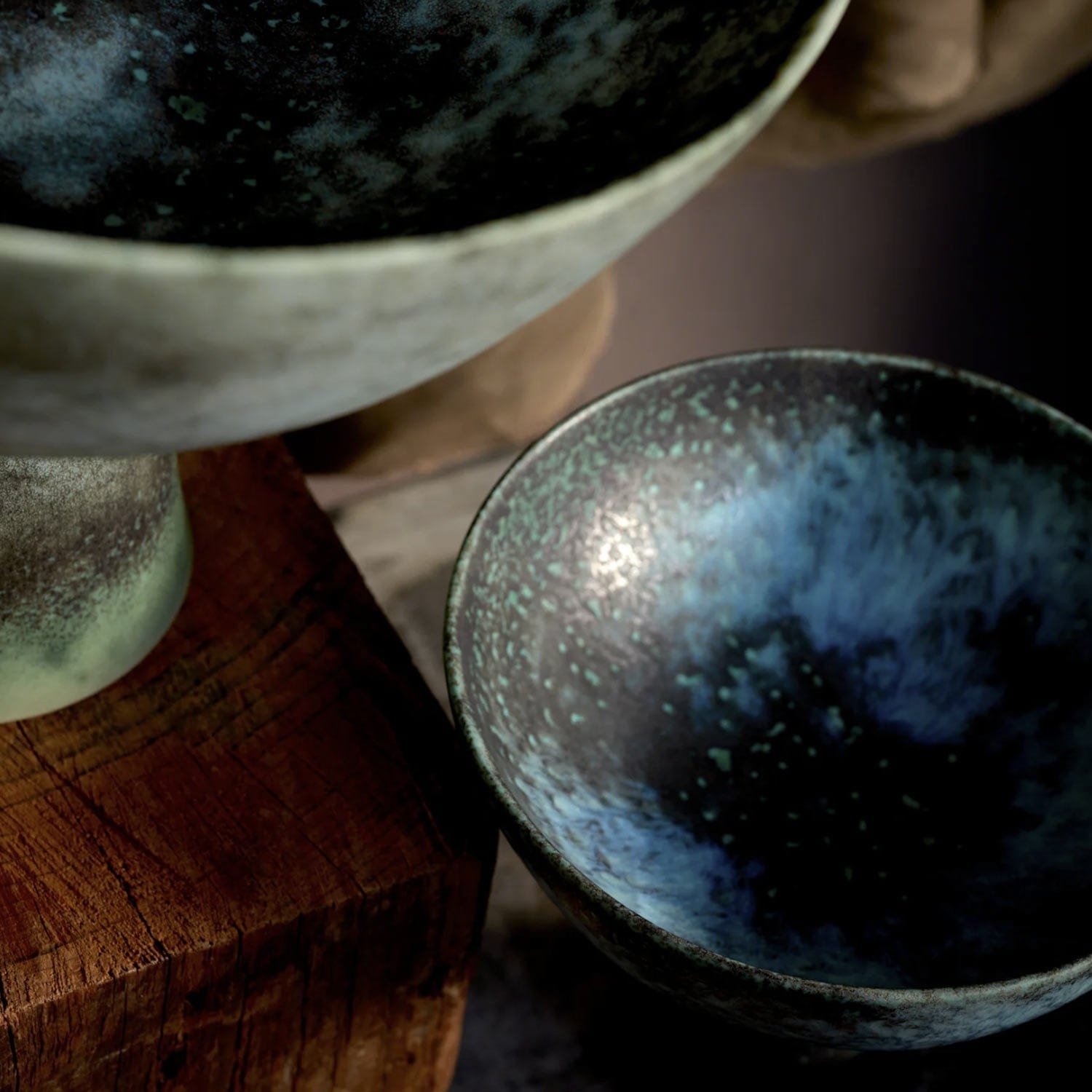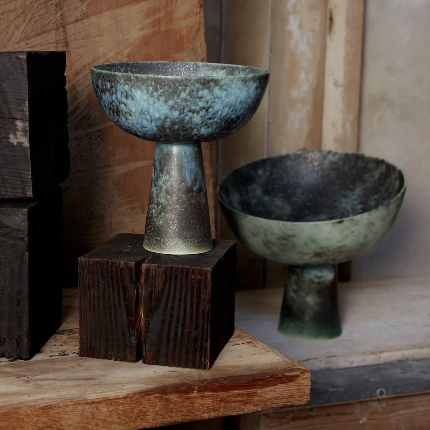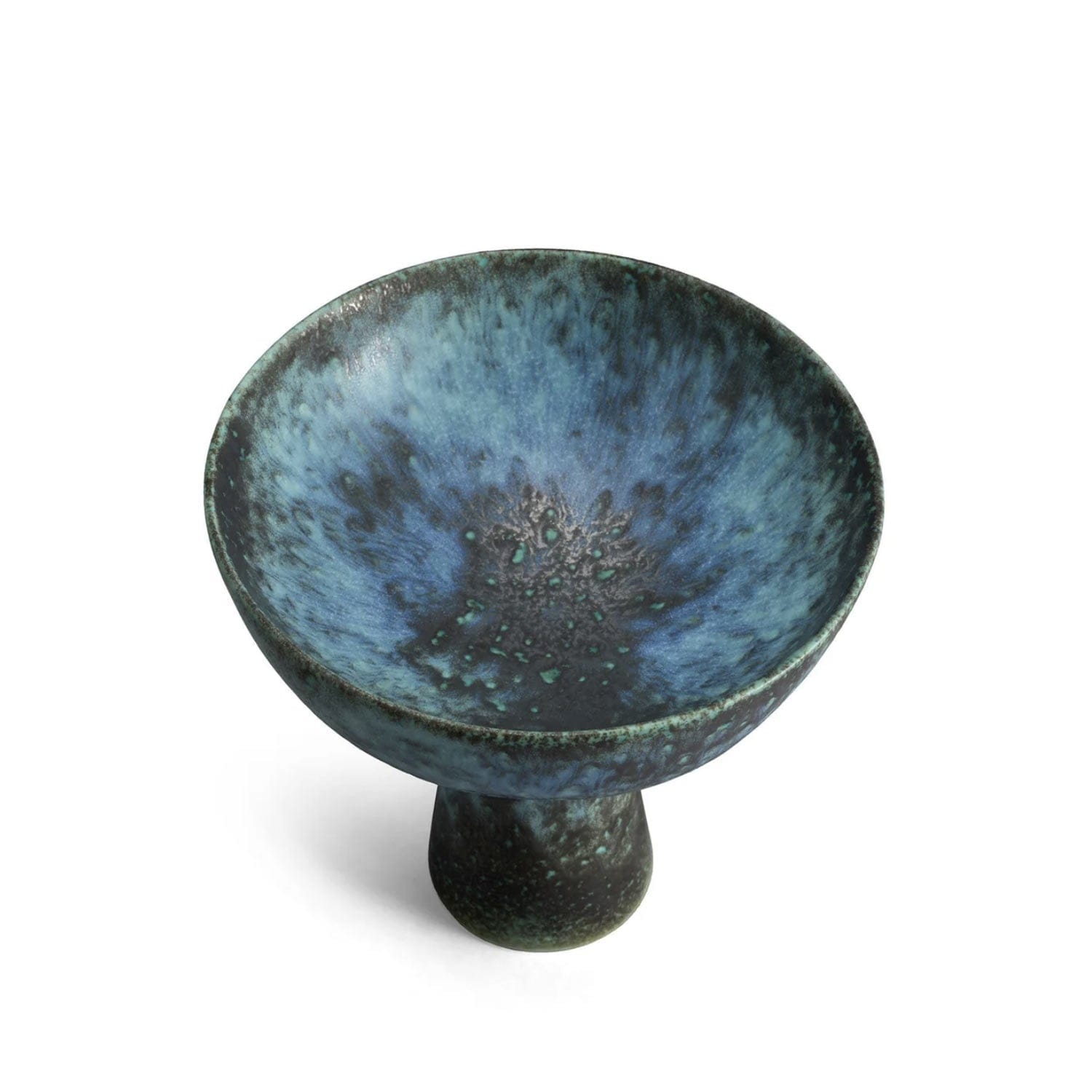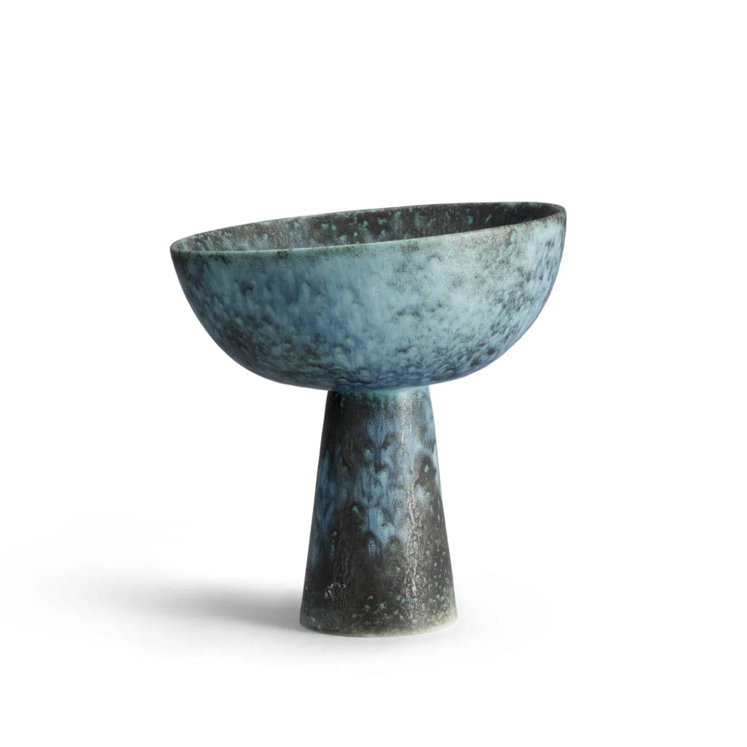 An iconic footed bowl in an oxidized bronze glaze that coordinates with decorative pieces from our Cenote collection. Each bowl flaunts a unique position of resting on its stand, determined by its position in the kiln during the firing. In a group this lends an organic quality, resembling a cluster of wild mushrooms.