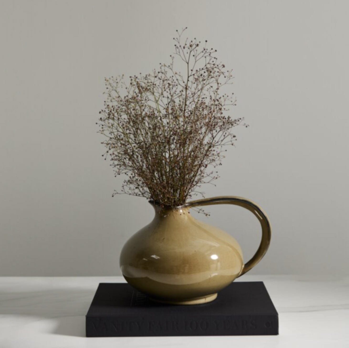 With an old-world silhouette but modern, smooth glossy finish, the large ceramic Serpentine Pitcher brings shapely interest to kitchen counters, a console, or styled shelves. A warm brown glaze offers variation with deeper brown undertones. Featuring a rounded body, exaggerated curvy handle, & slightly angled spout, this charming vessel makes a nice decorative pitcher or vase for a few leafy stems.